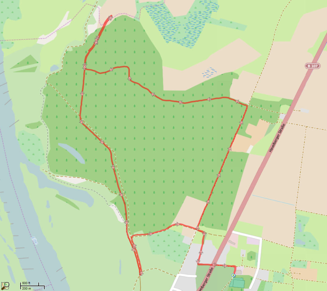 Sandau. Die restliche Strecke führt über Betonspuren sowie Wald- und Wirtschaftswege wieder zur B107 und zurück ins Ziel.